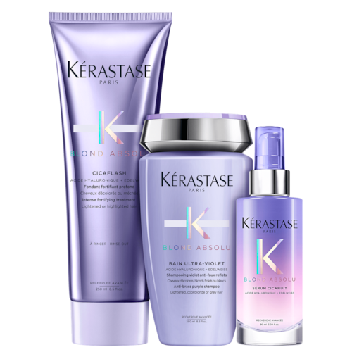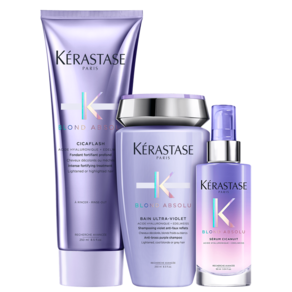 Kit com shampoo desamarelador, condicionador e sérum. Kérastase Blond Absolu Ultra-Violet Cicanuit neutraliza tons indesejados enquanto repara os danos.
