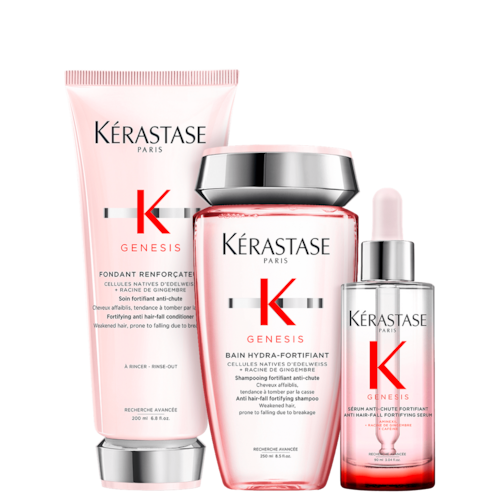 O Kit Kérastase Genesis Fortifiant Trio limpa e hidrata, com Células Nativas de Eldelweiss, Raiz de Gengibre e Aminexil. Nutre a extensão capilar, para evitar quebras, e ajuda a reforçar as defesas saudáveis do couro cabeludo, para estimular a fixação da raiz da fibra. Diminui o desconforto da região em até 3 semanas e garante uma queda controlada em após 6 semanas de uso.