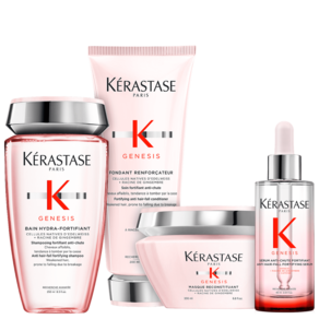 Kit antiqueda com shampoo para cabelos oleosos e finos, condicionador, máscara e sérum de tratamento. Kérastase Genesis Quotidien Complet traz o cuidado diário para fortalecer, hidratar e nutrir a fibra capilar.