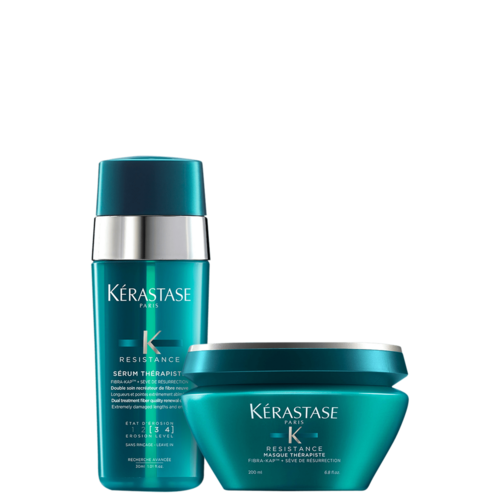 Kit com máscara e sérum para cabelos com danos profundos causados pela química sucessiva. Kérastase Résistance Thérapiste Força e Reconstrução reconstrói as fibras capilares, fortalecendo os fios fragilizados.