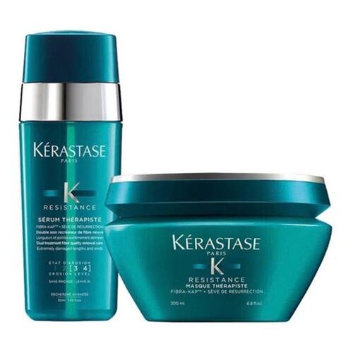 RECONSTRUÇÃOKérastase Masque Therapiste - Máscara 200gRésistanceMáscara de tratamento de reconstrução profunda para cabelos extremamente danificados e submetidos a muitos processos químicos. Com a tecnologia de Fibra KAP + Sève de Réssurrection, um inovador complexo que age na reparação profunda da fibra capilar, recuperando a sua força e elasticidade. Com ela, o cabelo fica fortalecido e revitalizado. RECONSTRUÇÃOKérastase Sérum Thérapiste - Sérum 30mlRésistanceSérum para cabelos extremamente danificados e submetidos a muitos processos químicos. Com a tecnologia de Fibra KAP + Sève de Réssurrection, ele restaura a fibra capilar instantaneamente, dando-lhe força e proteção contra os danos causados pelo secador, além de prevenir as pontas duplas.