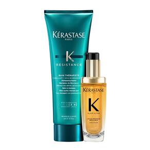 Kit com shampoo e óleo para cabelos superprocessados e quimicamente danificados. Kérastase Résistance Elixir Ultime L'Huile Originale ajuda a reconstruir a força e a beleza dos seus fios!
