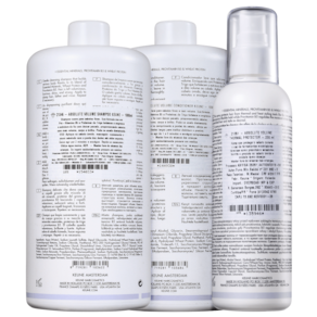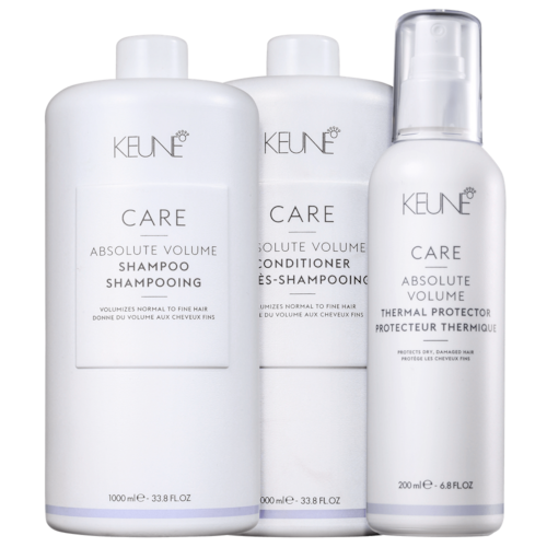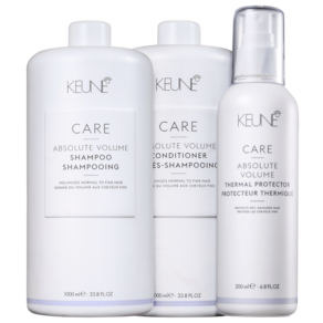 Kit com shampoo, condicionador e mousse para cabelos finos e sem volume. Keune Care Absolute Volume Thermal Protector Salon proporciona mais volume, corpo e brilho aos fios.
