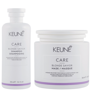 Kit com shampoo e máscara, tamanho profissional, para cabelos descoloridos e danificados. Keune Care Blonde Savior Mask Super Duo reparação e força imediata aos fios.