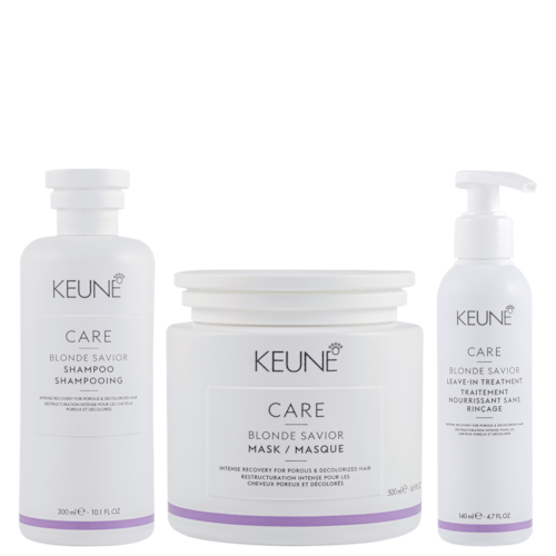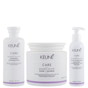 Kit com shampoo, leave-in e máscara, tamanho profissional, para cabelos descoloridos e danificados. Keune Care Blonde Savior Mask Super Duo reparação e força imediata aos fios.