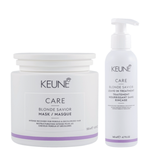 Kit com máscara, tamanho profissional, e leave-in para cabelos danificados e descoloridos. Keune Care Blonde Savior Treatment Salon força, reparação e proteção instantânea dos fios