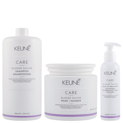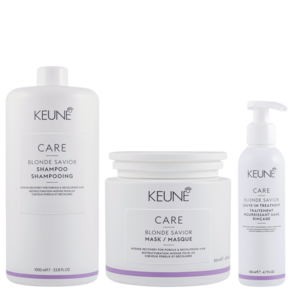 Kit de tamanho profissional, com shampoo, máscara e leave-in para cabelos danificados e descoloridos. Keune Care Blonde Savior Trio força e reparação imediata dos fios