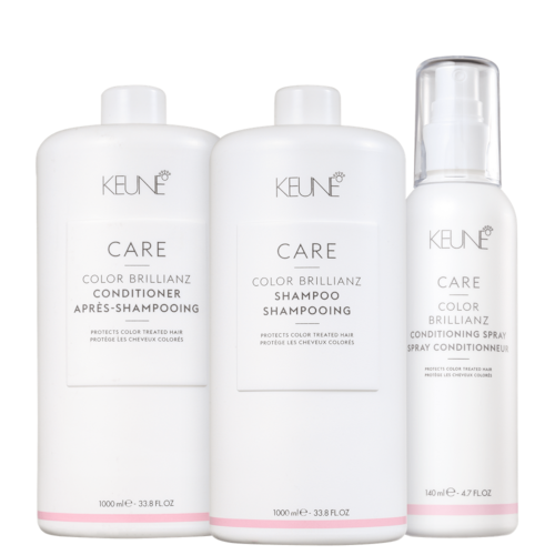 Kit com shampoo, condicionador e leave-in para cabelos coloridos. Keune Care Color Brillianz Duo Plus Salon mantém a cor vibrante e protegida por mais tempo.