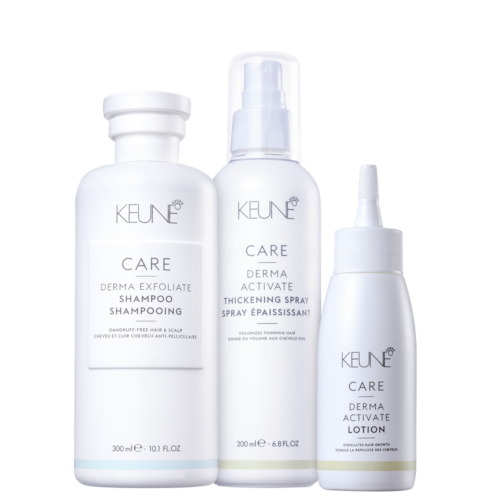Kit de tratamento para cabelos finos com caspa e queda. Keune Care Derma Activate Exfoliate Trio remove a caspa e combate a queda capilar.