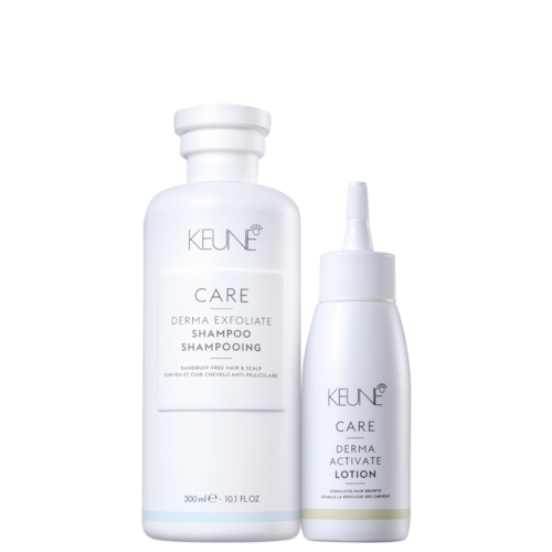 Kit de tratamento para cabelos finos e com caspa. Keune Care Derma Exfoliate Activate mantém o couro cabeludo saudável e fios mais encorpados no dia a dia.