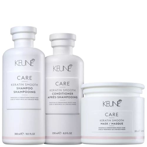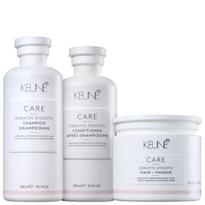 O Kit Keune Care Keratin Smooth Reconstrução Profunda conta com o novo complexo de minerais essenciais, que penetram com os outros ingredientes com mais intensidade nos fios, para devolver as proteínas perdidas na fibra capilar fragilizada enquanto deixa o cabelo com movimento natural novamente.