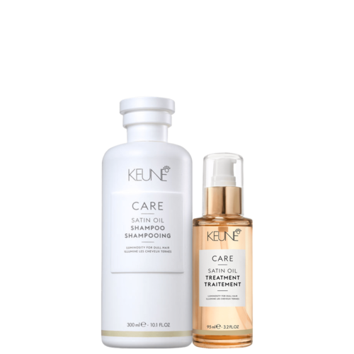 Kit com shampoo e óleo para cabelos secos e opacos. Keune Care Satin Oil Treatment proporciona redução de frizz enquanto devolve o brilho, a maciez e o movimento para os fios.