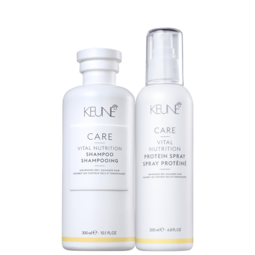 Kit com shampoo e leave-in para cabelos secos e danificados. Kit Keune Care Vital Nutrition Repair para devolver a vitalidade aos fios enquanto limpa e protege.