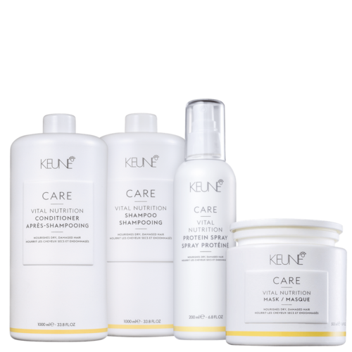 Kit de tratamento, em tamanho profissional, para cabelos secos e danificados. Keune Care Vital Nutrition Salon Quarteto hidrata, protege e revitaliza aos fios.