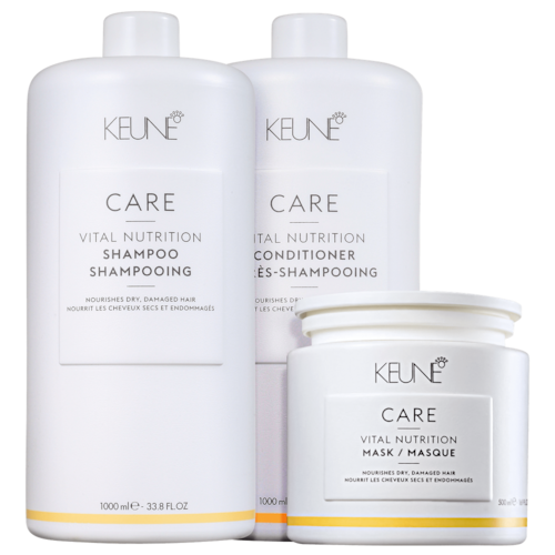 Kit com shampoo, condicionador e máscara para cabelos secos e danificados. Keune Care Vital Nutrition Trio Salon recupera a maciez, resistência e brilho dos fios, sem pesar.