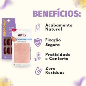 O Kit Kiss New York: Unhas Postiças Bailarina Longo Lavender e Abas Adesivas é a solução ideal para quem busca unhas impecáveis com a praticidade que o dia a dia exige. Imagine ter unhas perfeitas, com um toque de elegância e sofisticação, sem precisar gastar horas no salão. Este kit completo oferece unhas postiças incrivelmente naturais, transformando suas mãos e permitindo que você expresse sua criatividade através de nail arts deslumbrantes. Desfrute da beleza do formato bailarina longo, realçada pela delicadeza da cor French Lavender, e conquiste um visual moderno e elegante em instantes. Perfeito para mulheres que valorizam a beleza e a praticidade.