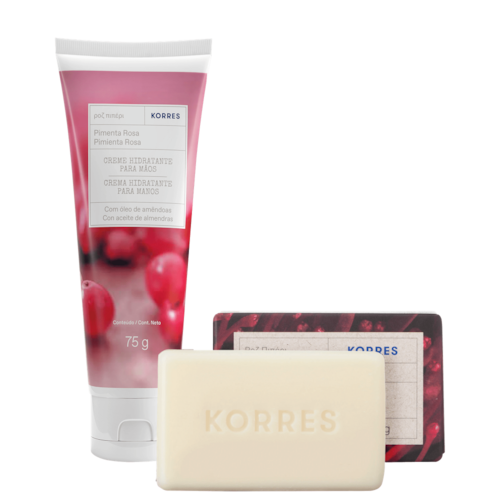 Kit com creme para as mãos e sabonete em barra cremoso. Korres Pimenta Rosa Duo é ideal para deixar a pele macia e perfumada.