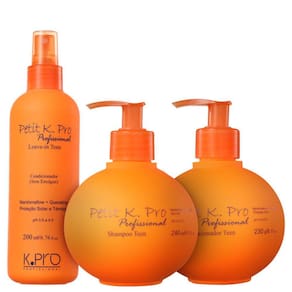 Kit infantil para todos os tipos de cabelo. Kit K.Pro Petit é para hidratação, limpeza equilibrada, proteção térmica e solar. Pode ser por crianças e jovens adolescentes.