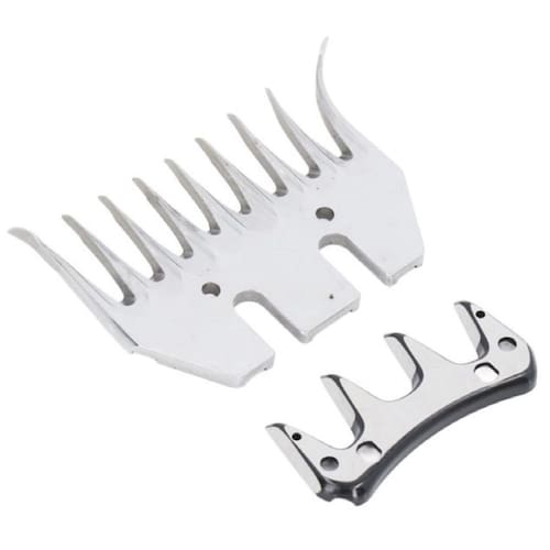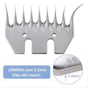O kit é composto por uma lâmina inferior de 9 dentes curva e uma lâmina superior de 4 dentes, ambas projetadas para oferecer precisão e eficiência no corte. Essas lâminas são compatíveis com diversas marcas de tosquiadeiras disponíveis no mercado.