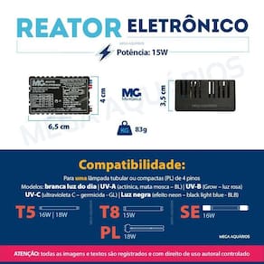 Especificações técnicas reator para lâmpada uv: Para lâmpada de 4 pinos fluorescente Partida instantânea 30% mais econômico em relação aos modelos eletromagnéticos Fabricante: margirius Modelo: pg 1x15 Voltagem: pode ser ligado em 110v ou 220v Dimensões: 6,5 x 3,5 x 4cm larg x alt x profundidade Peso: 83g Corrente: 0,28a 127v / 0,16a 220v Potência: 18w 127v / 17w 220v Temperatura máxima de trabalho: 75c.