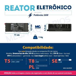 Kit lâmpada uv uv-c 25w tubular t8 germicida para esterilização de ambientes e água + reator próprio para lâmpada uv + par de soquetesLeia atentamente o anúncio antes da compraNossa lâmpada tubular germicida uv foi desenvolvida com tecnologia de ponta para garantir a mais alta qualidade e eficiência em desinfecção, é a escolha ideal para garantir um ambiente livre de germes e uma água cristalina para seu aquário ou lago.Principais características da lâmpada uv-c:Eficácia comprovada na eliminação de bactérias, vírus e outros micro-organismos nocivosA lâmpada uv-c germicida é uma poderosa ferramenta para manter ambientes saudáveisDeixa a água cristalina do lago ou aquário Pode ficar ligada 24h por diaTubular / linearTubo de quartzo transparente4 pinos, dois em cada pontaNecessita de equipamento próprio para desinfecção de ambientes ou um filtro uv para esterilização de águaNunca manuseie a lâmpada com ela ligada, não exponha olhos e pele à radiação da lâmpada. Aplicação - para que serve a lâmpada ultravioleta - uv-c germicida:Manter a água do aquário ou lago cristalina e livre de micro-organismos que possam prejudicar a saúde dos peixes e plantas.Tratamento de água e esgoto.Desinfecção de ambientes como hospitais, farmácias, restaurantes, academias, transporte público, indústrias alimentícias e outros locais que necessitam manter o ambiente seguro e livre de patógenos.Especificações técnicas lâmpada uv-c:Marca: mega aquáriosModelo: lâmpada uv uv-c germicida fluorescente ultravioleta 25wRadiação: emite radiação uv de onda com um pico de 253.7 nm uv-c Potência: 25wVoltagem: 110v / 220v pode ser ligada nas duas voltagens conforme ligação do reatorTamanho: 45cm pino a pinoDiâmetro: t8Soquete: g13Pinos: 4Formato: tubularMédia de vida útil: 8.000hPeso: 65g.Especificações e características soquete para lâmpada t8: Funciona com todos os modelos de lâmpadas de diâmetro t8, t10, t12 e lâmpadas de led desse diâmetroMarca: redyModelo: soquete base g13 tomadinha para lâmpada t8Base: g13Material: corpo em plástico pp polipropileno e contatos em latãoCorrente: 2aVoltagem: 110v ou 220v conforme ligação do reatorCor: brancoTamanho: 2,2cm de diâmetroRabicho: 12cm fio flexível 0,5mmTemperatura máxima de trabalho: 70cPeso unitário: 6g.Especificações técnicas reator para lâmpada uv:Para lâmpada de 4 pinos fluorescentePartida instantânea30% mais econômico em relação aos modelos eletromagnéticosFabricante: margiriusModelo: pg - 1x26Voltagem: pode ser ligado em 110v ou 220vDimensões: 11 x 3,5 x 4,3cm larg x alt x profundidadePeso: 114gCorrente: 0,228a 127v / 0,192a 220v Potência: 27w 127v / 26w 220v Temperatura máxima de trabalho: 75c.ImportanteJamais exponha os olhos ou a pele à radiação emitida pela lâmpada uv ultravioleta, sob risco de danos gravíssimos irreversíveis aos olhos além de queimaduras na pele. A utilização de equipamentos de segurança é obrigatória.Obrigado pela visita e boas comprasAtençãoNossas imagens e textos são registrados e com direito de uso autoral controlado e reservado a essa loja e as lojas parceiras devidamente autorizadas em contrato. Marca: Mega Aquarios