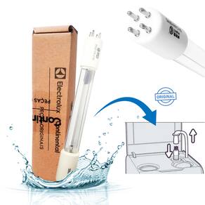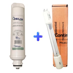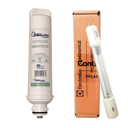 Kit com filtro refil compatível com purificadores Electrolux PA31G e lâmpada UV. Elimina cloro, gostos, cheiros e partículas sólidas, elevando o pH da água. Eficácia Anti-Microbiana 96%.Tipo