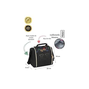 Lancheira: Confeccionada em Poliéster Isolamento térmico Alça de mão Alça que prende na mochila de rodinhas Design exclusivo Puxadores personalizados Fechamento em zíper Medidas aproximadas: Altura: 20 cm Largura: 12 cm Comprimento: 22 cm