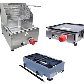 Conta com 1 Chapa Sanduicheira de 30cm com 1 queimador, 1 Fritadeira Profissional de 1 Cuba 5 Litros e 1 Fogão 2 queimadores alta pressão, ambos produtos a gás.
