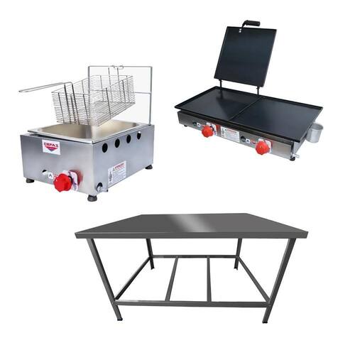 Esse Kit conta com Mesa de Manipulação para você preparar os alimentos, Fritadeira para fritura de suas porções e uma Chapa para preparação do seu cardápio!