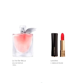 Eficácia: O perfume combina frescor frutado, flores nobres e um toque gourmand, criando um aroma elegante e marcante. O batom oferece cor vibrante (vermelho Adoration), acabamento matte aveludado e hidratação por até 18 horas, com aplicação suave e confortável.
