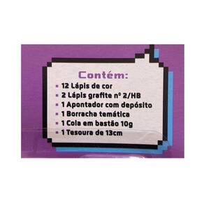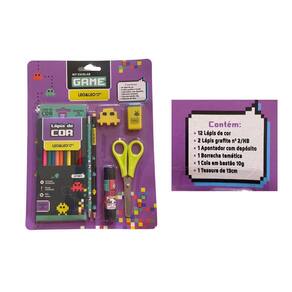 Este kit tem toda uma temática gamer retro, com pixel arts nos seus lápis, borracha com formato de alien dos jogos retro e etc..