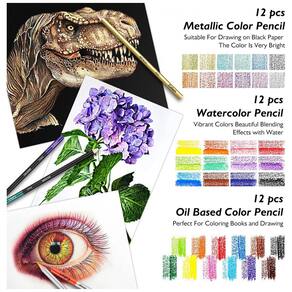 Tudo em um kit de arte O conjunto de lápis de desenho Premium inclui 12 lápis de grafite, 12 lápis de cor, 12 lápis de aquarela, 12 lápis de carvão, 3 lápis de carvão branco, 12 lápis metálicos, 3 tocos de papel de mistura, caneta de pincel de água recarregável, estojo de viagem e mais Cada lápis é marcado com nome e número de cor e pré afiado. 76 peças de acessórios de ferramentas de arte mais um bloco de desenho de 100 folhas, total de 176 peças Perfeito para desenhar, esboçar, sombrear, misturar.