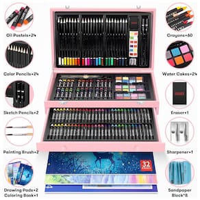 Suprimentos de arte suficientes Este conjunto de desenho Premium inclui 24 lápis de cor, 24 pastéis de óleo, 24 bolos de aquarela, paletas de 3x8 poços, 2 blocos de desenho, 1 livro de colorir, 2 lápis de desenho, 2 pincéis, 10 blocos de lixa, 1 apontador de lápis, 1 régua, 1 borracha, 60 giz de cera, 1 estojo de arte em madeira e caixa de presente. Eles são as melhores ferramentas para mostrar o incrível talento de alguém no desenho. Grandes conjuntos de arte para crianças pequenas que são iniciantes e exploram sua curiosidade