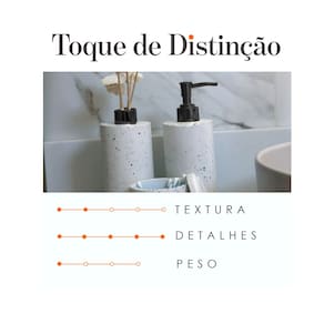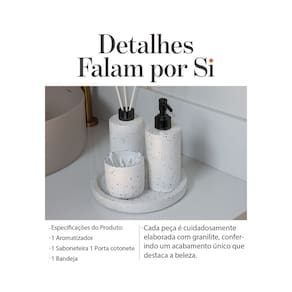 Especificações Técnicas do Produto: Material: Feito de cimento e Marmore durável e resistente. Acabamento: Granilite, proporcionando um visual elegante. Válvulas: Plástico, garantindo praticidade no uso. Cor da Válvula: Preto Garantia: Oferecemos uma garantia de 6 meses contra defeitos de fabricação, proporcionando segurança e confiança para você. Itens Inclusos: 1 - Saboneteira 1 - Aromatizador 1 - Porta Cotonetes 1 - Bandeja Qualquer duvida estamos a disposição. Marca: Multitudo Casa