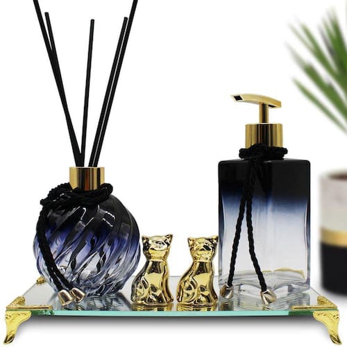 Kit Lavabo Luxo Difusor E Saboneteira Com Bandeja DouradoDecoração para Lavabo, Banheiros e AmbientesSeu Kit acompanha:• 2 Frascos• 1 Válvula pump• 1 Válvula difusora• 1 Bandeja espelhada• 2 Enfeite DecorativoDIMENSÕES:• Aromatizador 250ml:- Altura: 11cm- Largura: 5,5cm•Saboneteira 270ml:- Altura: 11cm- Largura: 9,5cm• Bandeja espelhada: 23cm x 13 cm- Espessura: 4mm-Material: Vidro Espelhado• Válvula: 5,5 cm x 3 cm x 5 cm- Bico: 5,5 cm x 1,2 cm- Material: PlásticoAs imagens com as dimensões dos produtos são somente ilustrativas Marca: Lavabo