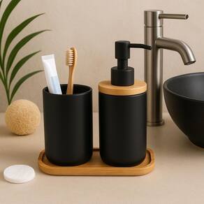 Simplicidade que encanta Se você acredita que menos é mais, o este Kit Lavabo Minimalista é a escolha certa. Com um design liso, sem texturas e de acabamento impecável, ele traz uma sofisticação discreta, adaptando-se perfeitamente a qualquer estilo de decoração. Seu toque fosco e aveludado transmite elegância, enquanto a combinação com a base de bambu reforça a harmonia e o equilíbrio do ambiente. Por que você vai amar esse modelo -design clean e atemporal, perfeito para qualquer decoração -Acabamento fosco que transmite sofisticação sem excessos -Estilo versátil, ideal para lavabos clássicos ou contemporâneos Para quem valoriza sofisticação sutil e uma estética minimalista. Especificações Técnicas:Cor: Preto- Porta Sabonete LíquidoMaterial: Porcelana e BambuMedidas Aproximadas: Altura: 12 cm x Diâmetro: 7cm- Porta ObjetosMaterial: Porcelana e BambuMedidas Aproximadas: Altura: 10 cm x Diâmetro: 7cm- Bandeja:Material: Porcelana e BambuMedidas Aproximadas: Altura: 0,9 cm x Largura: 9 cm x Comprimento: 17 cmImagens IlustrativasComposição da Embalagem:1 Porta Sabonete Líquido1 Porta Objetos1 Bandeja
