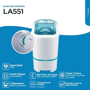 A Lavadora LA551 oferece 7 programas de lavagem com 2 molhos automáticos, garantindo limpeza profunda em roupas do dia a dia, tecidos delicados e peças pesadas como edredons.