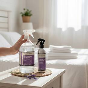 Kit composto por água perfumada para roupas e perfume para ambientes com fragrância de lavanda. Proporciona aroma suave, fresco e relaxante, ideal para perfumar tecidos e ambientes com sensação de limpeza e bem-estar.