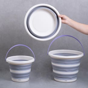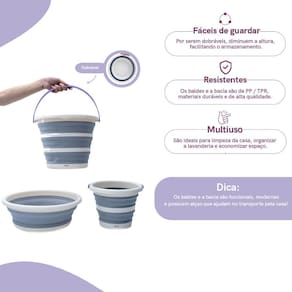 Conheça o Kit Lavanderia com 2 baldes dobráveis de plástico de 5L e 10L e bacia de 5L da Simplo.Multiuso, resistentes e fáceis de guardar, são itens ideais para organizar a lavanderia e economizar espaço! Os baldes possuem alça para facilitar o transporte, são retráteis com aros estruturados e diminuem a altura em até 5 vezes. A bacia é dobravél e é possível diminuir a altura em até 3 vezes.São de PP / TPR. Limpe bem e seque a bacia antes de guardar. Evite deixar no sol ou perto de outras fontes de calor. Não use com água sanitária e outros produtos que contenham cloro, removedores, produtos à base de petróleo ou líquidos oleosos.Leve funcionalidade e modernidade para sua casa!O kit contém:1 Balde dobrável de plástico 10L1 Balde dobrável de plástico 5L1 Bacia dobrável de plástico 5L Marca: SIMPLO
