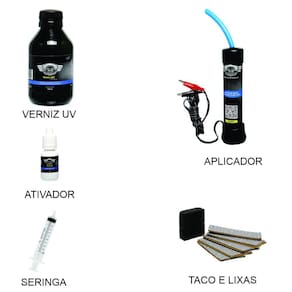 1 Verniz de 120 ml que rende ate 10 aplicações1 Ativador de 5 ml que rende ate 10 aplicações 5 Kit de abrasivos contendo: 7 lixas (80, 150, 220, 400, 600, 800, 1200)1 Aplicador 12V com tomada para bateria do veiculo ou fonte 12V1 Direcionador1 Seringa dosadora1 Taco de lixamento1 Luva descartável 1 Pano de microfibras1 Curso explicativo no QR Code