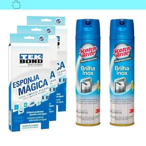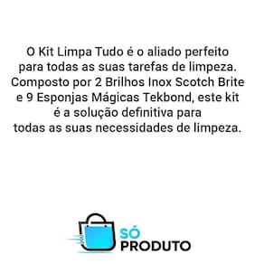 O kit limpa tudo é o aliado perfeito para todas as suas tarefas de limpeza. Composto por 2 brilhos inox scotch brite e 9 esponjas mágicas tekbond, este kit é a solução definitiva para todas as suas necessidades de limpeza. Começando pelos brilhos inox, são produtos eficientes e práticos de serem aplicados, limpando e dando brilho em uma única operação. Além disso, não deixam resíduos gordurosos na superfície, formando uma camada protetora entre a superfície e o ambiente. O brilho inox scotch brite é indicado para aço inox, cromado, alumínio, objetos esmaltados, peças de cerâmica, madeira envernizadas, oferecendo um ótimo rendimento com apenas uma aplicação. Por outro lado, a esponja mágica tekbond é desenvolvida para remover manchas, riscos e sujeiras de vários materiais. Ela é indicada para o uso doméstico e remove facilmente sujeiras e impurezas. Constituída em plástico expandido a base de melamina na cor branca, é ideal para limpar sujeiras mais resistentes e manchas mais difíceis. Com o kit limpa tudo, você terá uma solução completa e eficiente para todas as suas tarefas de limpeza. Com 2 brilhos inox e 9 esponjas mágicas, você poderá deixar sua casa brilhando e livre de sujeiras, sem precisar se preocupar com a utilização de produtos químicos agressivos. Adquira já o seu kit limpa tudo e experimente a eficiência destes produtos As imagens são meramente ilustrativas Marca: So Produto