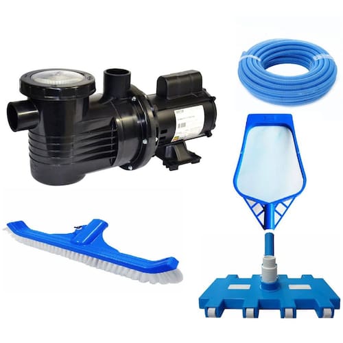 Especificações técnicas: - Bomba de piscina Dancor: 1/2 cv, bivolt - Aspirador de 8 rodas Netuno - Escova para piscina Netuno - Peneira para piscina Netuno - Mangueira para piscina: 10 metros