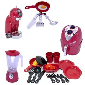 Kit liquidificador brinquedo cafeteira chef vermelho 20pç produto em estoque o kit vem com kit panelinha com louça, air fryer, panelinha com acessório , cafeteira com cápsula, liquidificador informações adicionais: --------------------------------------------------------------------------------------------- - 1 air fryer de aproximadamente 13cm de altura x 9 cm de largura com gaveta removível