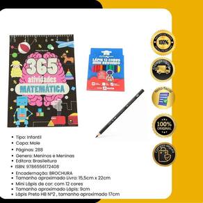 Contém : 1 unidade Livro Infantil 365 Atividades Educativas Matemática + 12 unidades mini lápis de cor + 1 lápis grafite 2/HB. Uma seleção de atividades de raciocínio matemático, associação e memorização, além de outros enfoques estão reunidas para divertir, instruir e estimular a criatividade e imaginação dos pequenos e vorazes leitores. Esta obra contém atividades de coordenação motora, letras, palavras, escrita, opostos, formas, números, operações matemáticas, desenhos para colorir, cruzadinhas, labirintos, ligação de ponto e muito mais Complete o aprendizado da criança, de forma lúdica, flexível e progressiva. Habilidades desenvolvidas: - Estímulo visual; - Concentração; - Coordenação motora; - Criatividade e Imaginação; - Reduz e ansiedade. - Raciocínio Lógico. - Conceitos Matemáticos. Autor: Todolivro Páginas: 288 Dimensões: 15,5 x 22 cm Formato: Brochura Faixa etária: 5 anos. Marca: BrasiLeitura Faixa etária: A partir de 5 anos ISBN: 9786556172408 Editora: BrasiLeitura Dimensões: 15.50 x 22.00 cm Idioma: Português Diversão Garantida: Com 365 atividades emocionantes, o livro promete transformar cada dia em uma nova aventura cheia de diversão e aprendizado. Desenvolvimento Criativo: Estimula a criatividade das crianças através de jogos, labirintos e desafios que incentivam a imaginação e o pensamento crítico. Variedade de Jogos: Oferece uma ampla gama de atividades, garantindo que as crianças nunca fiquem entediadas e sempre tenham algo diferente para explorar. Qual é a medida de cada lápis de cor Cada lápis possui 9 cm de comprimento, um tamanho ideal para as mãos pequenas das crianças, facilitando o manuseio. Qual é a medida de lápis hb Possui 17 cm de comprimento. Marca: Não Informado
