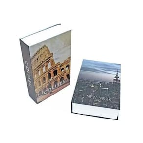 o cofre camuflado é ideal para guardar objetos de valor de forma discreta e despercebida. Super realista, tem aparência de livro e pode ser camuflado facilmente na estante ou prateleira. Super resistente, possui um mecanismo de cofre com chave e pode ser levado em viagens para transportar coisas de valor sem levantar suspeitas. Fabricado em metal, porém revestido com uma capa idêntica às capas de livros convencionais. Acompanham 2 chaves para maior segurança. Caracteristicas do produto - capas , new york ou coliseu - material metal e papelão - por fora um livro e por dentro um cofre de metal, fechado a chave. - ideal para guardar objetos de valor, camuflado em sua estante. Marca: unyhome imagens meramente ilustrativa