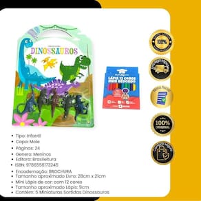 Contém : 1 unidade livro infantil de colorir mais cor e diversão com 5 mini dinossauros + 12 mini lápis de cor