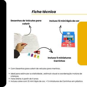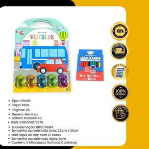 Contém : 1 unidade livro infantil de colorir veículos mais cor e diversão com 5 mini carrinhos + 12 mini lápis de cor