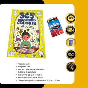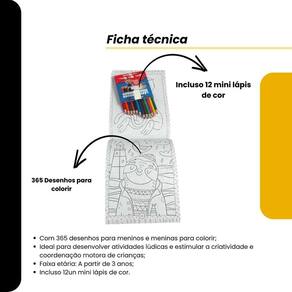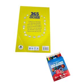 Contém : 1 unidade Livro Infantil 365 Desenhos para colorir + 12 unidades de mini lápis de cor Qual é a medida de cada lápis Cada lápis possui 9 cm de comprimento, um tamanho ideal para as mãos pequenas das crianças, facilitando o manuseio.