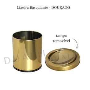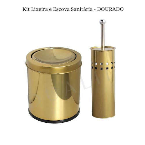 Lixeira de Inox Basculante e Escova Sanitária - DOURADOLixeira BasculanteCapacidade: 5,4 litros Dimensões: 21,5cm altura x 19cm diâmetro Material: Aço InoxMaterial do cesto removível: PlásticoPossui cesto de descarte removível 5,4 litros .A lixeira possui pintura de alto padrão e brilho, o que a torna mais resistente à umidade e à exposição ao sol.Escova SanitáriaDimensões: 10cm largura x 38cm altura Material da base: Aço InoxMaterial da escova: PlásticoCuidados com o produto: Utilize esponja macia e lave com sabão ou detergente neutro. Enxague e seque bem para evitar manchas. Seque manualmente e evite produtos abrasivos.Todos os nossos produtos estão disponíveis no Red Gold, Rose Gold, Cobre e outros verificar disponibilidade de cores .Conheça também nossos acessórios diversos para decoração de lavabo, cozinha e outrosTem alguma pergunta ou quer verificar modelos e cores Tire sua dúvida no chat Responderemos o mais rápido possível.-dualii Metais Marca: Dualii Metais