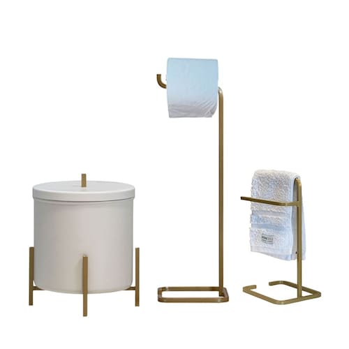 Para quem busca transformar até os menores detalhes do ambiente com elegância e funcionalidade, o Kit com Lixeira, Porta Papel e Porta Toalha em dourado é a escolha certa. Ideal para banheiros e lavabos sofisticados, o conjunto traz um visual moderno e refinado, unindo praticidade e design em peças resistentes e duráveis.
